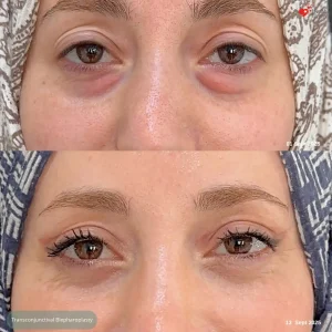 In classic lower eyelid surgeries, an incision is made through the skin; with the transconjunctival method, we enter from the inner surface of the eyelid, meaning the mucosal part called the conjunctiva. This way, no external incision or suture scar forms on the skin.